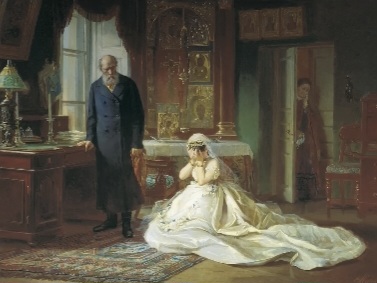 주라블료프의 1874년 작품 결혼식 전은 제목만 보면 설렘이 가득한 혼례 준비를 떠올리기 쉽지만, 화면이 전하는 감정은 정반대입니다. 중심에 놓인 신부는 웨딩드레스를 입고도 축복받는 사람처럼 보이지 않습니다. 표정은 굳어 있고, 몸의 긴장과 시선은 도망치고 싶은 마음을 드러내며, 기쁜 날이라는 사회적 문구가 개인의 감정을 얼마나 손쉽게 지워버리는지 보여줍니다. 이 장면이 강렬한 이유는 신부가 특별히 비극적인 개인이라서가 아니라, 당시 사회가 요구하던 결혼의 표준 절차가 이미 비극을 포함하고 있기 때문입니다. 결혼은 사랑의 결실이 아니라 가문의 관계를 묶고 재산을 이동시키는 장치로 기능했습니다. 신부의 의사와 욕망은 논의의 대상이 아니라 처리해야 할 변수에 가까웠고, 당사자가 침묵할수록 절차는 더 매끄럽게 진행되었습니다. 주라블료프는 바로 그 ‘매끄러움’ 속의 폭력성을 포착합니다. 화면 주변의 어른들은 신부의 상태를 걱정하기보다, 일정과 체면을 확인하는 듯 보입니다. 관람자는 신부가 느끼는 공포와 무력감을 따라가게 되고, 결혼이라는 제도가 개인의 삶을 어떤 방식으로 압박하는지 자연스럽게 읽게 됩니다. 이 작품은 한 가정의 사적인 사건을 그린 듯하지만, 실제로는 사회가 개인을 다루는 방식(특히 여성의 삶을 결정하는 방식)을 전면에 드러내는 구조적 기록입니다.